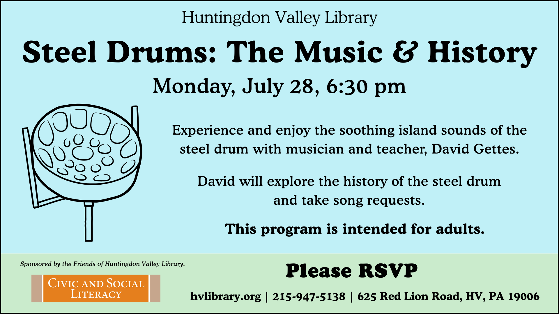 Steel Drums: The Music & History, Mon., July 28, 6:30 pm