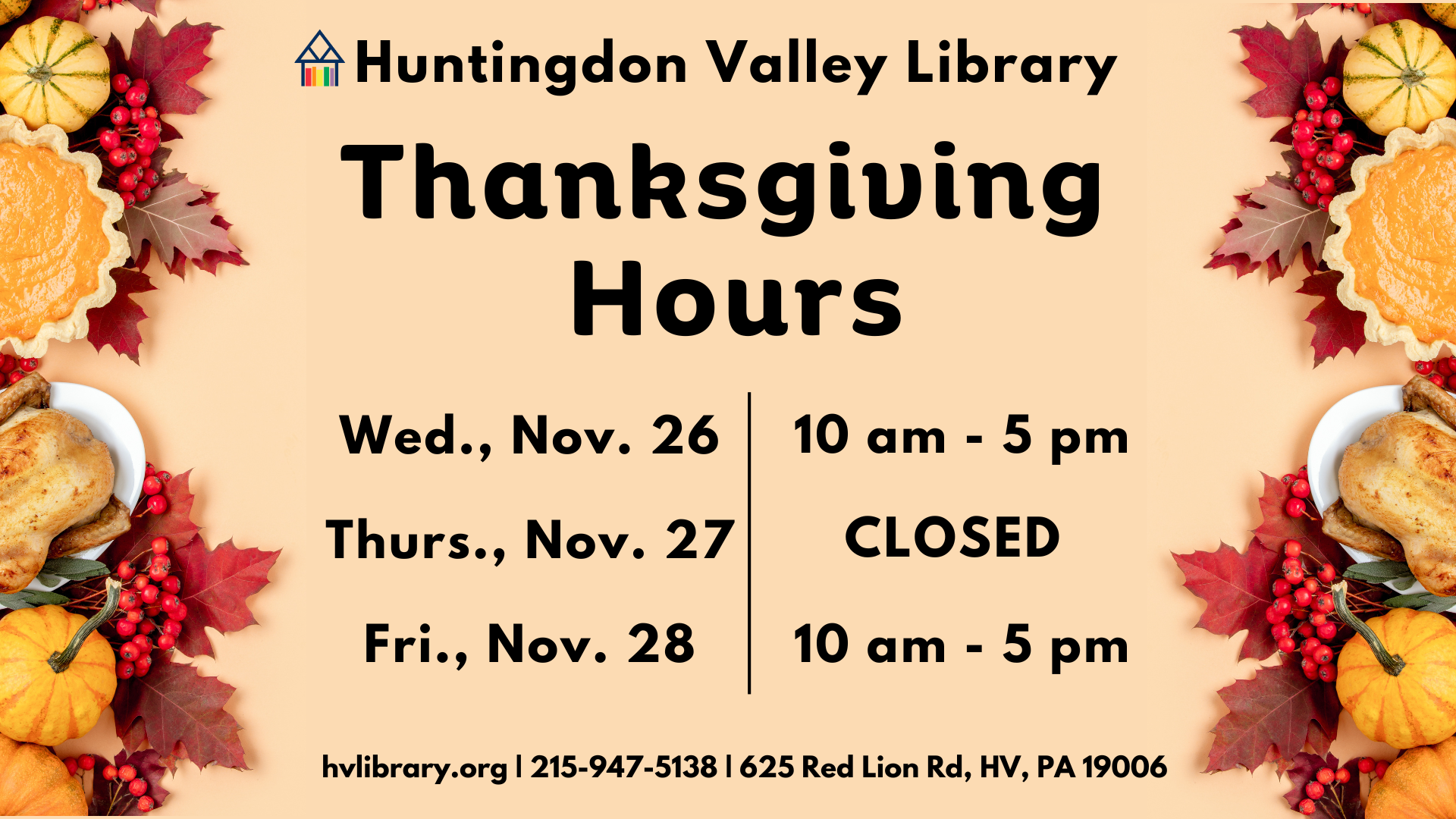 Huntingdon Valley Library will be closing early at 5 pm on Wednesday, November 26 and will be closed on Thursday, November 27 for Thanksgiving.
