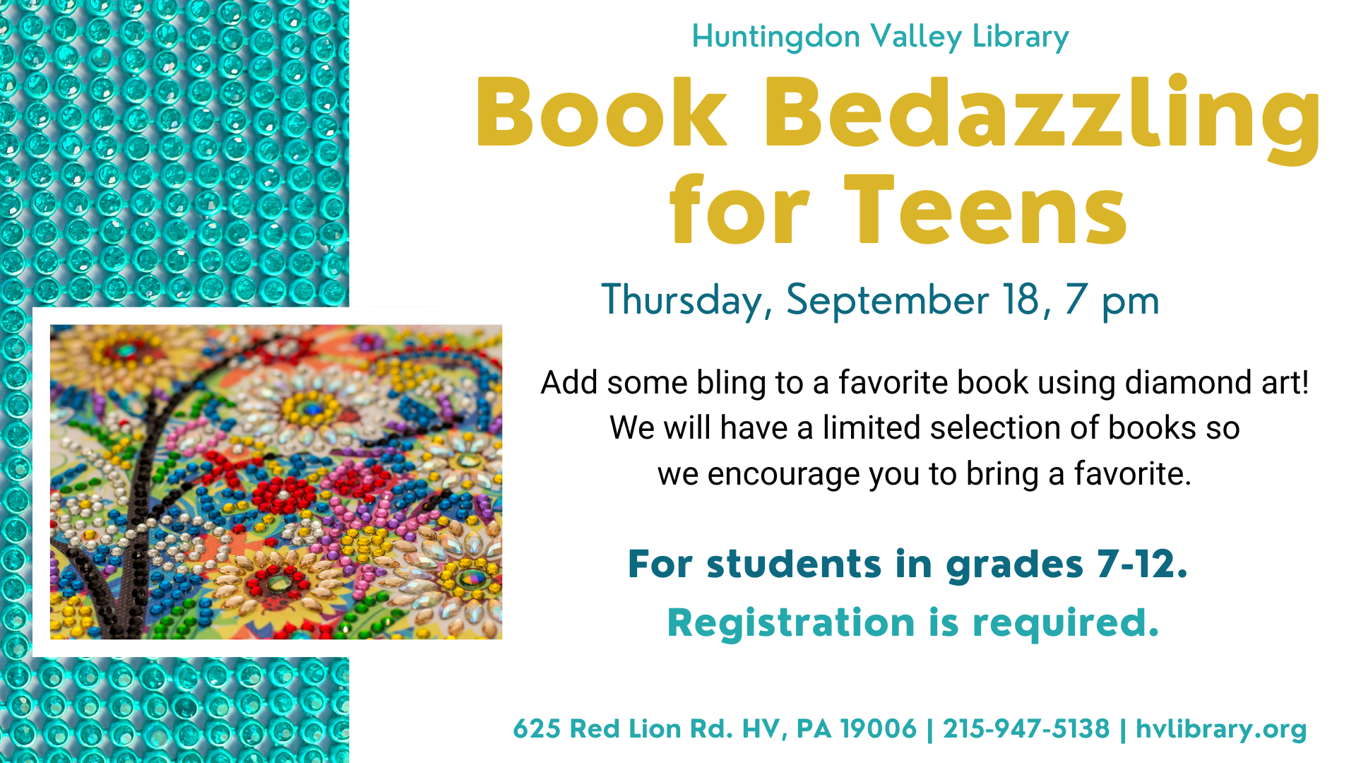 Participants are encouraged to bring a hard cover book from home, but the library will also have a few copies of books to choose from as well (no titles can be guaranteed, so if you have a favorite you want to bedazzle please bring a copy!). In addition to all diamond art supplies, snacks will be available as we spend an evening creating a bookish piece of art to take home.