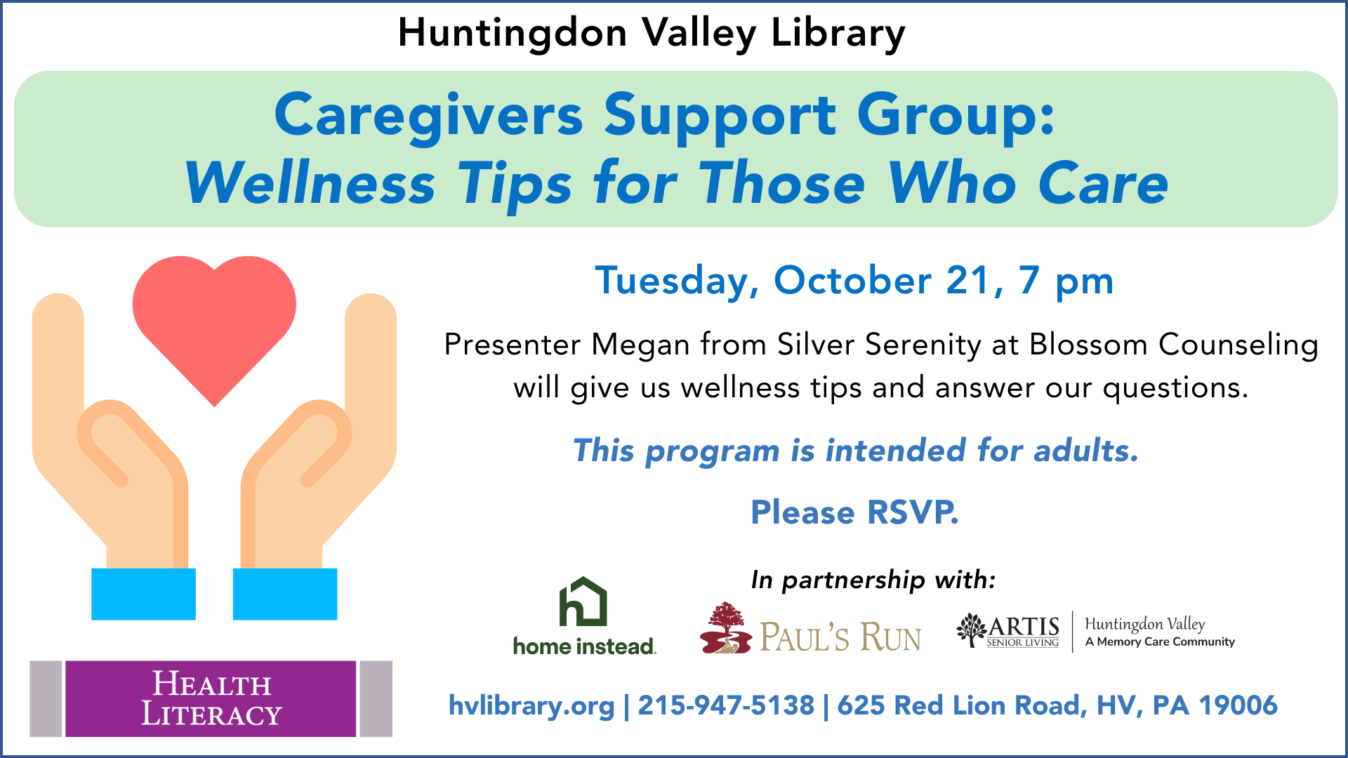 Caregivers Support Group: Wellness Tips for Those Who Care, Tues., Oct. 21, 7 pm