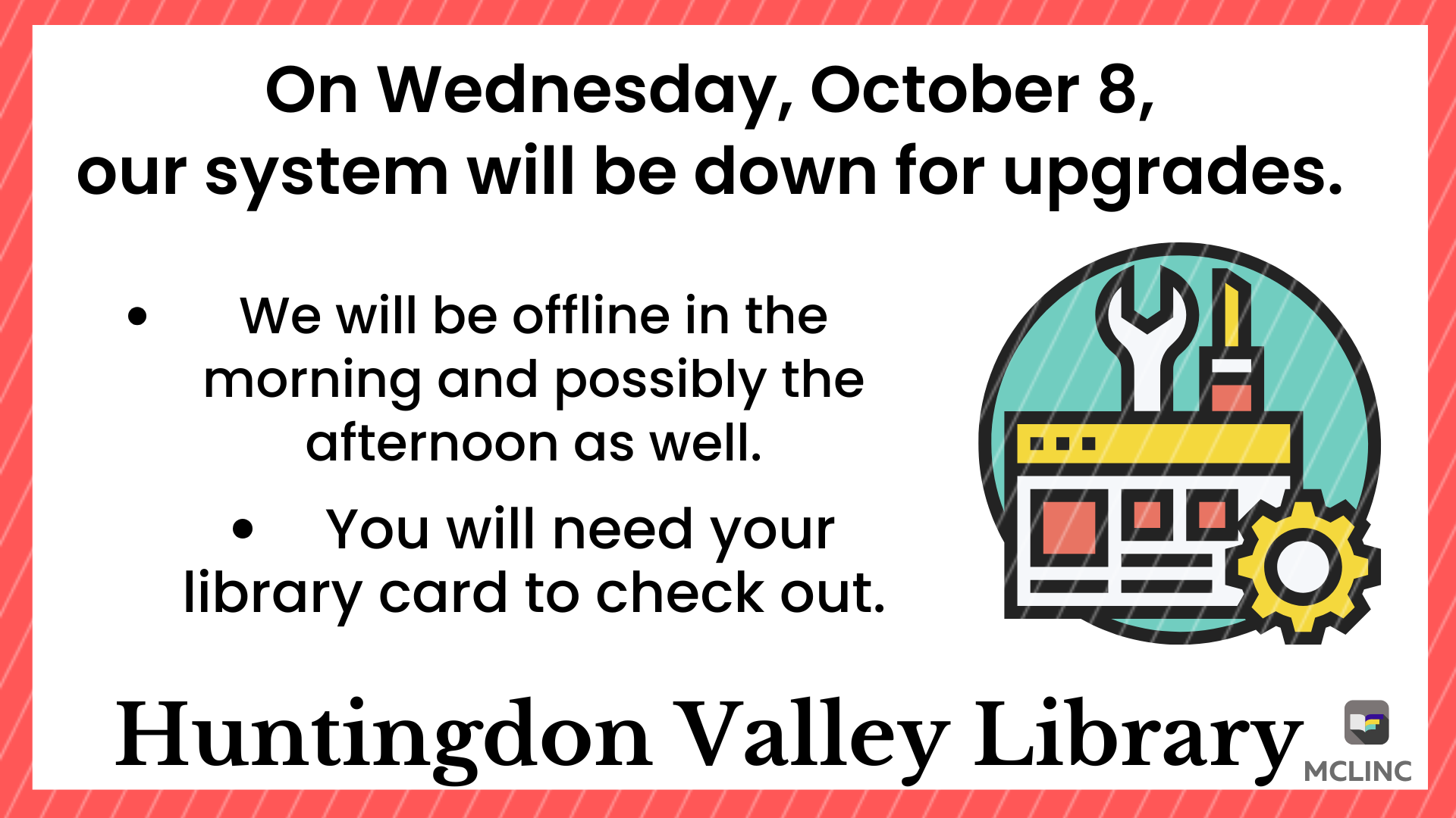 Library Offline for Upgrades on Wednesday, October 8 September 30, 2025 Kristen Adults, Archive, Kids, Seniors, Teens On Wednesday, October 8 our system will be down for upgrades. We expect to be offline in the morning and possibly the afternoon as well. You will need your library card to check out. Thank you for your patience.