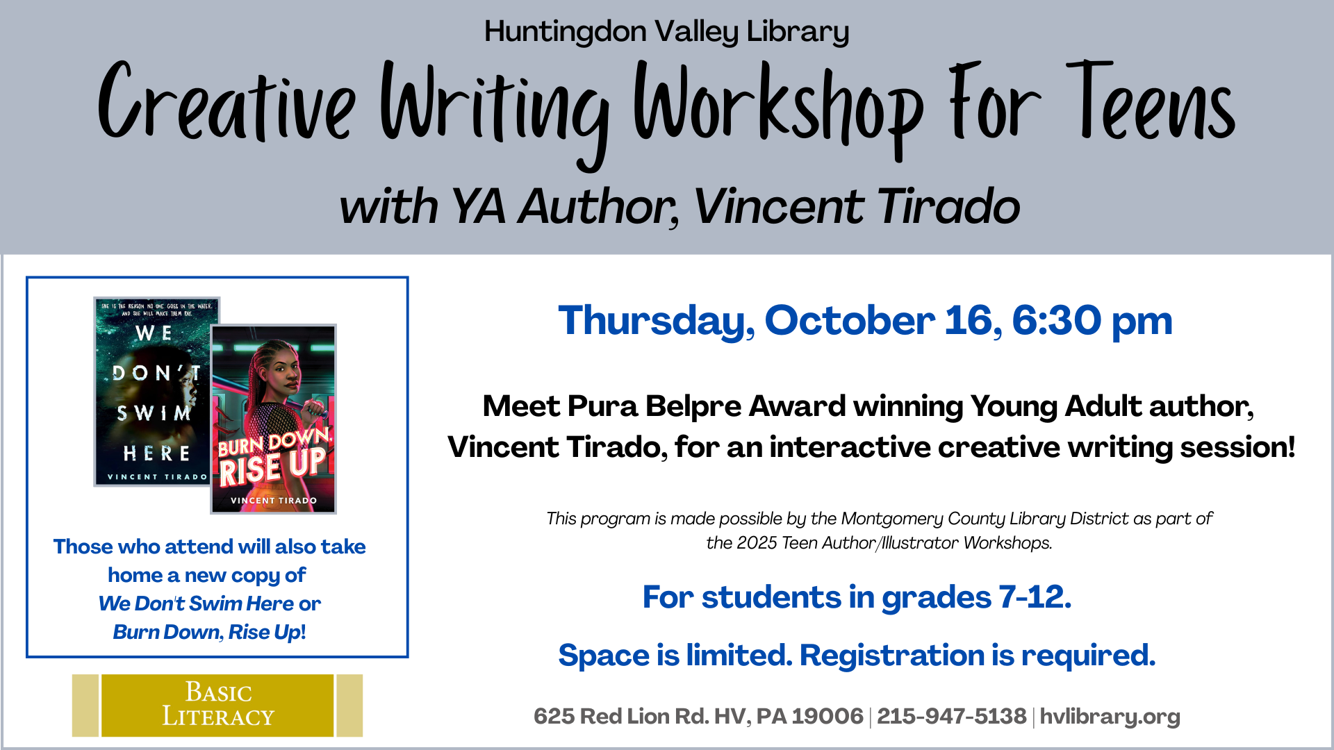 Creative Writing Workshop for Teens w/YA Author, Vincent Tirado, Thurs., Oct. 16, 6:30 pm
