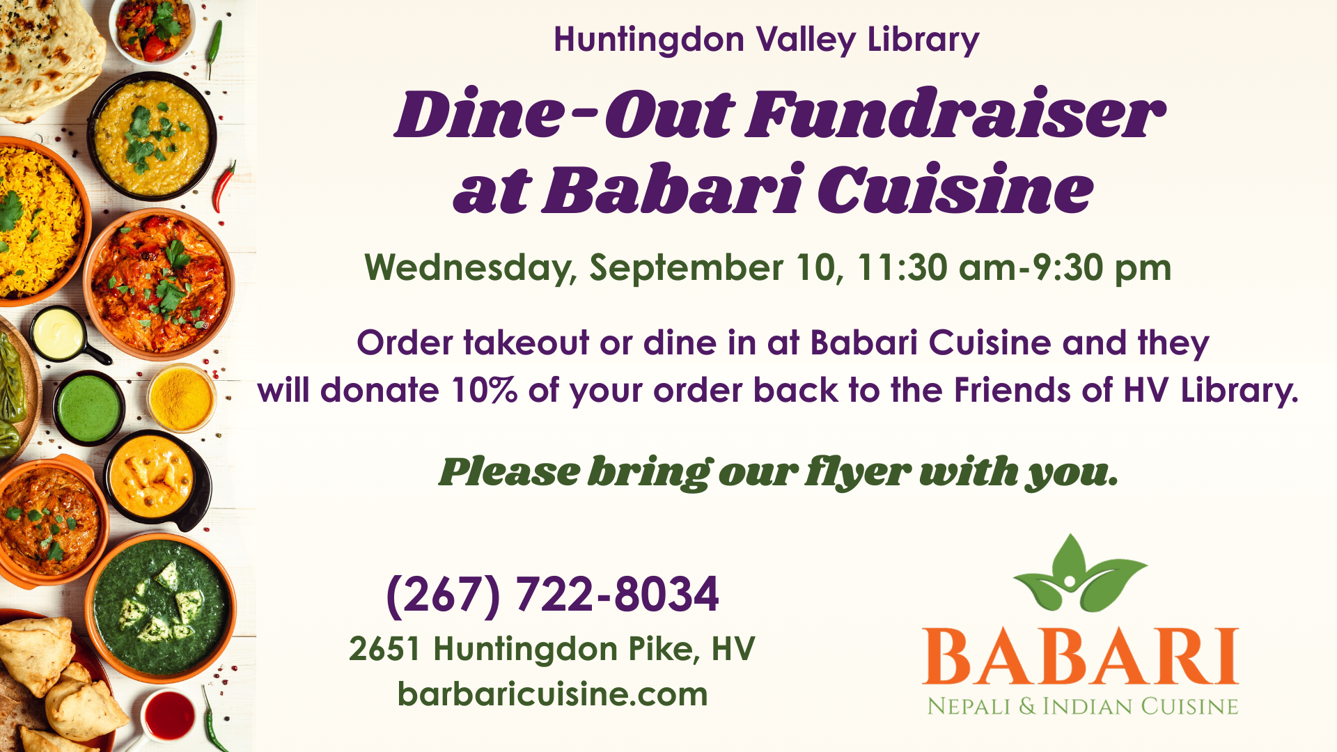 Dine in or order takeout from Babari Cuisine in Huntingdon Valley on Wednesday, September 10 and they will donate 10% of your purchase to the Friends of Huntingdon Valley Library.
