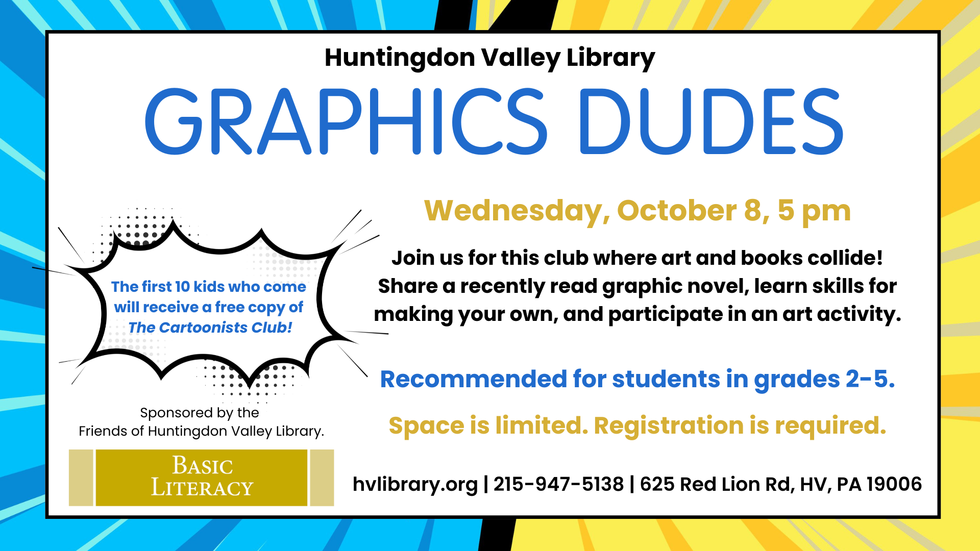 Join us for this club where art and books collide! Share a recently read graphic novel, learn something new about how to make your own, and participate in a comic-related art activity. The first 10 kids who come will receive a copy of The Cartoonists Club by Raina Telgemeier and Scott McCloud to keep for inspiration!