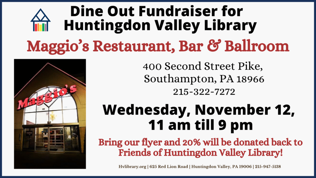 Dine In at Maggio’s Restaurant, Bar & Ballroom in Southampton on Wednesday, November 12 and 20% of your food bill will be donated back to Friends of Huntingdon Valley Library. It’s a win-win!