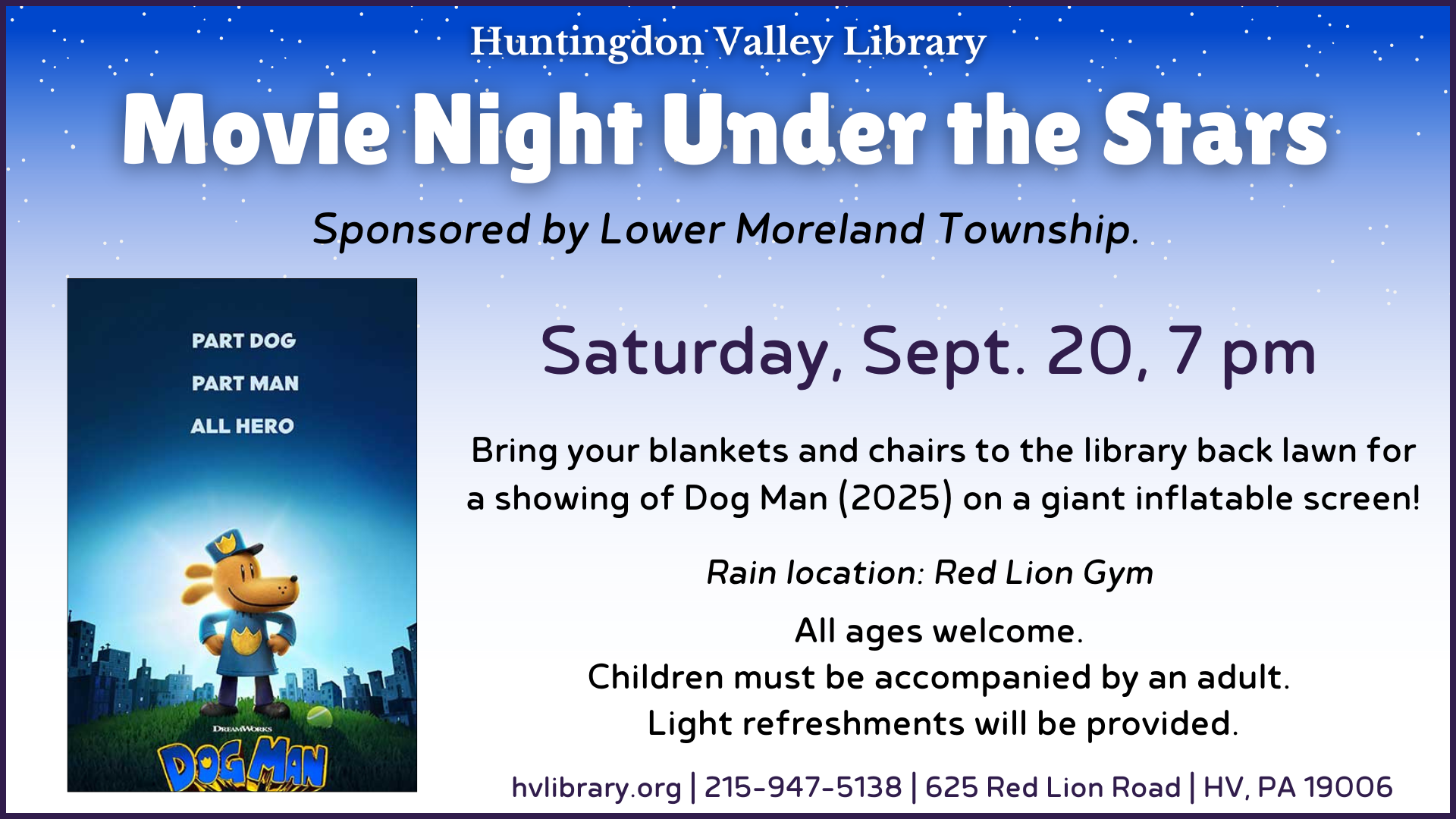 Bring your blankets and lawn chairs for a showing of the movie Dog Man (2025) on a giant inflatable screen!