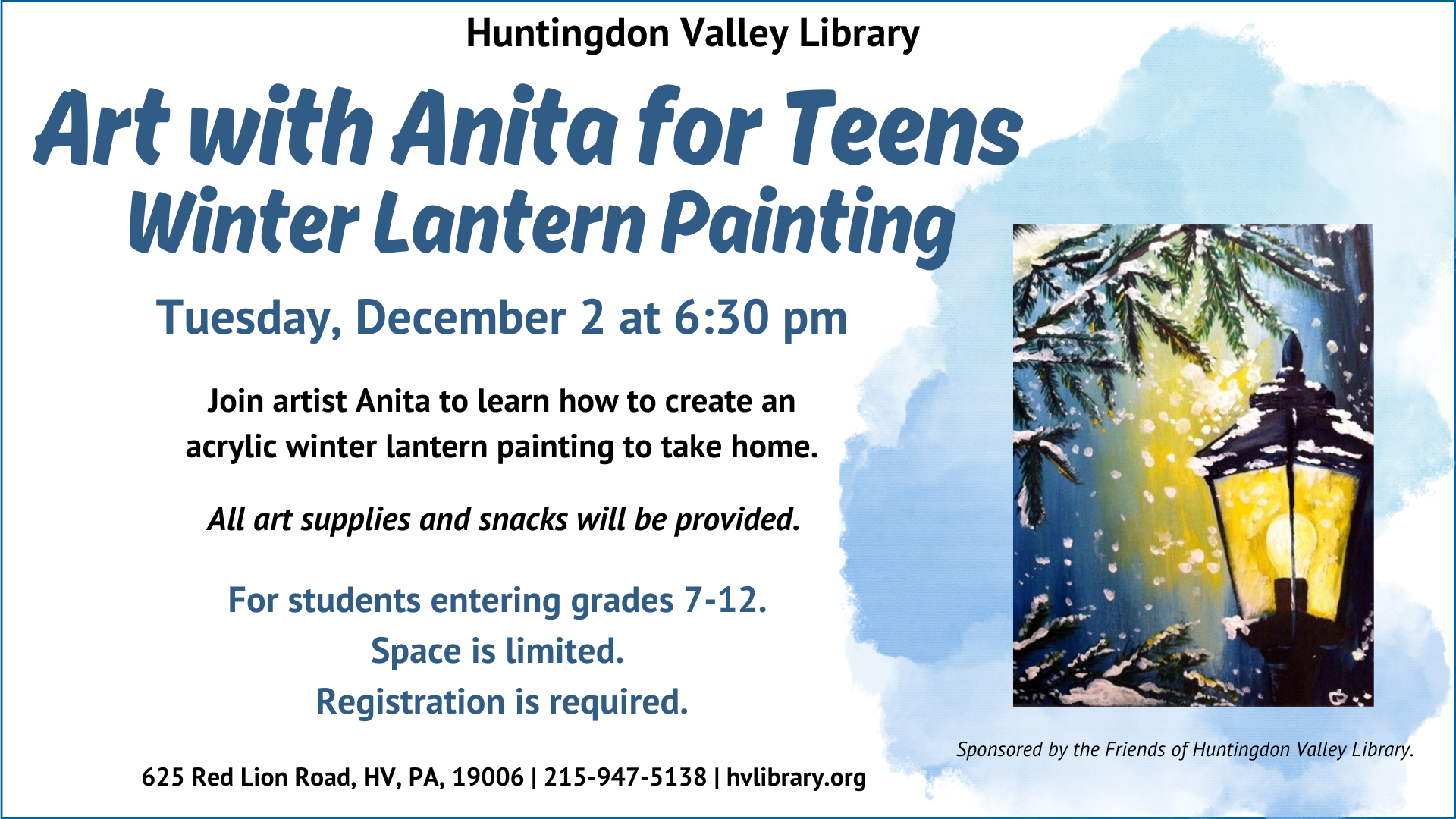 Art with Anita for Teens: Winter Lantern Painting, Tues., Dec. 2, 6:30 pm