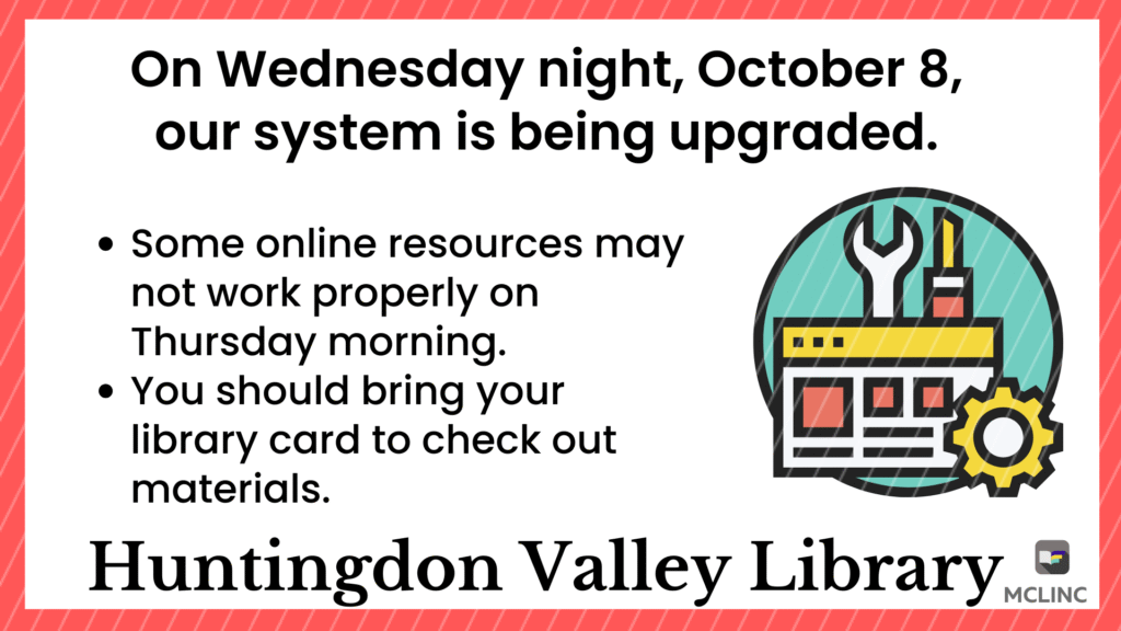 Library Upgrades Overnight on Wednesday, October 8 October 5, 2025 Kristen Active, Adults, Kids, Seniors, Teens Our system is being upgraded late on Wednesday, October 8. As a result, some online resources might be down on Thursday, October 9. Please bring your library card to check out just in case. Thank you for your patience.