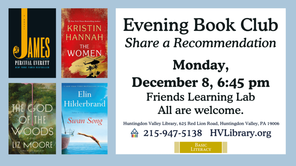 Evening Book Club, Mon., Dec. 8, 6:45 pm October 19, 2025 Marketing Active, Adults, Seniors Join us for a friendly meeting to share book recommendations and a dollar store gift exchange. Monday, December 86:45pm Free and Open to all. Located in the Friends Learning Lab.