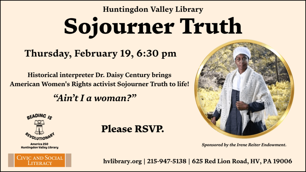 Join actor, educator, and historical interpreter Dr. Daisy Century as she returns to HVL as American Women’s Rights activist, Sojourner Truth.