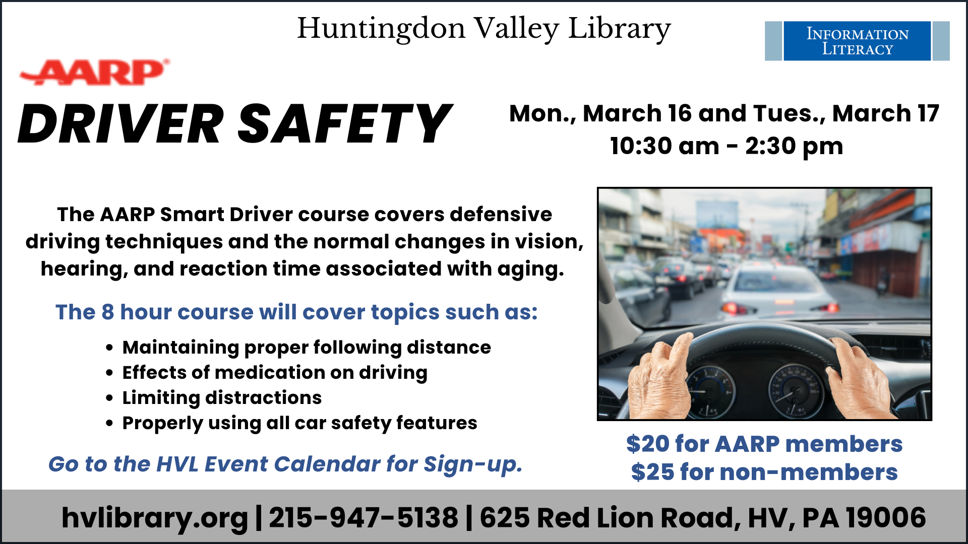 AARP Driver Safety Course, Mon., March 16 and Tues., March 17, 10:30 am-2:30 pm