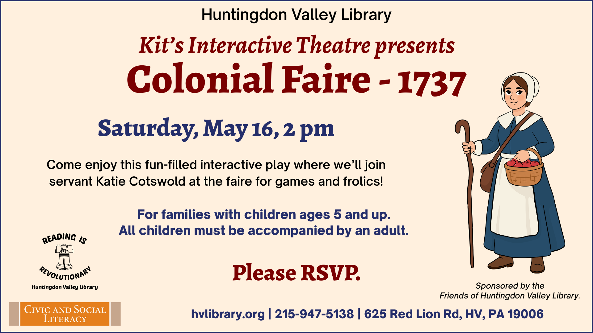 Come enjoy a fun-filled interactive play by Kit’s Interactive Theatre that depicts the arduous life of early America as well as the revelry. Though days of rest are few, today is the day of the Colonial Faire. Help indentured servant Katie Cotswold finish her chores so all may skip off to the faire. Partake in games and frolics where merriment abounds just before the rollicking Maypole dance!