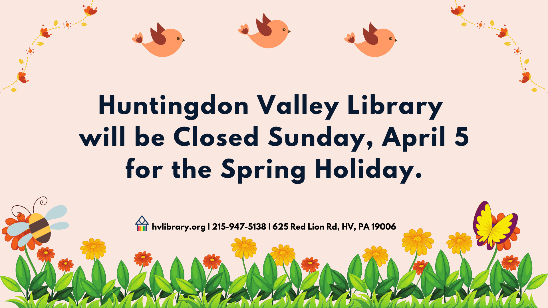 Huntingdon Valley Library will be closed for the spring holiday on Sunday, April 5.