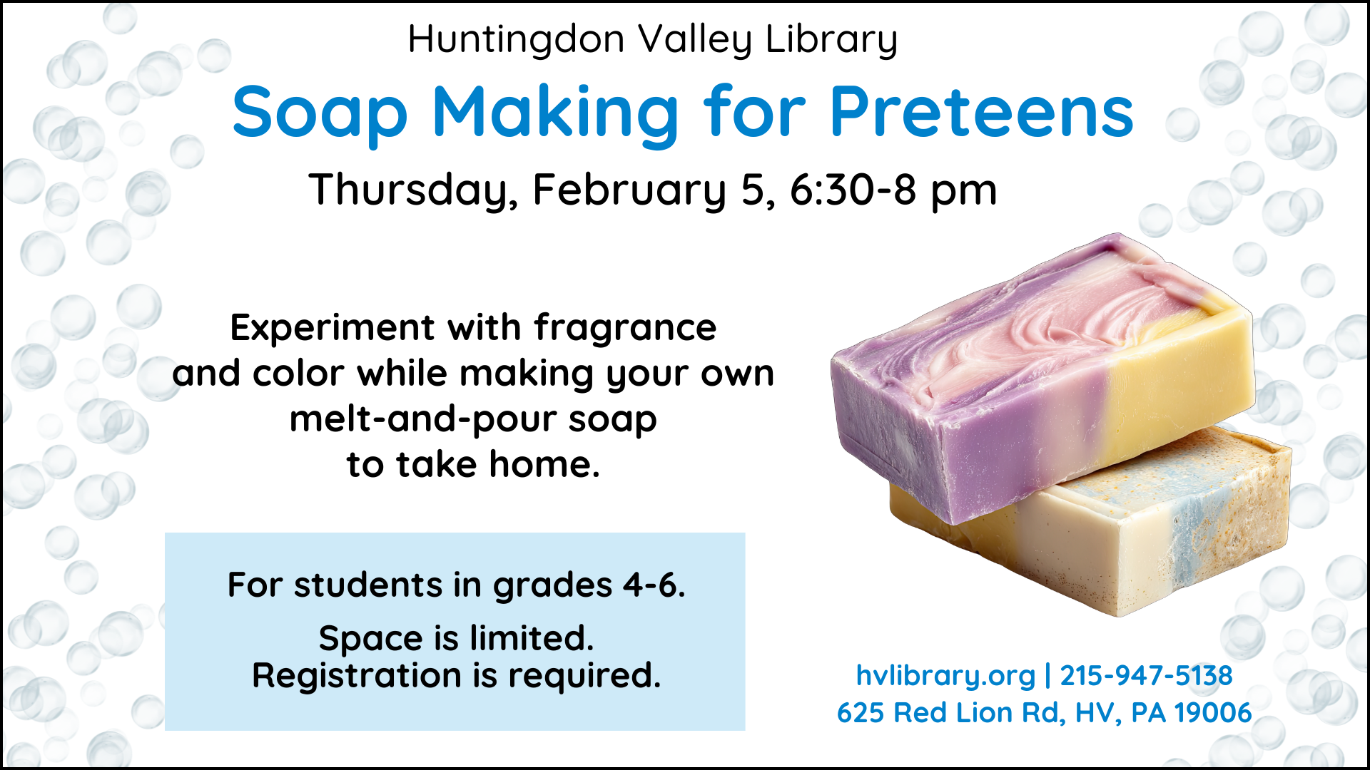 Soap Making for Preteens, Thurs., Feb. 5, 6:30 pm