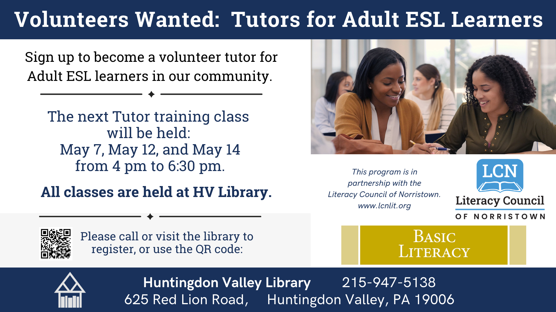 If you would like to volunteer please sign up for the Orientation. If you have questions you may call the Literacy Council at 610-292-8515. All training and tutoring will take place at Huntingdon Valley Library.