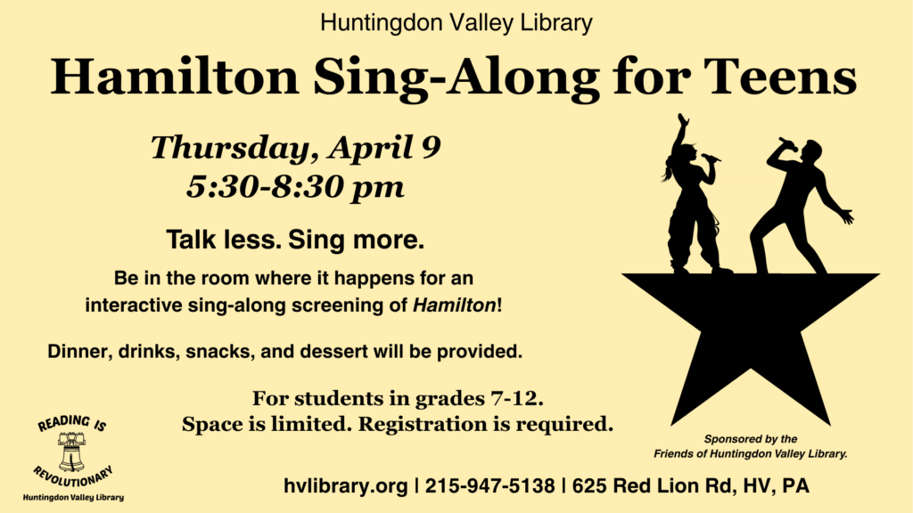 Hamilton Sing-Along for Teens, Thurs., April 9, 5:30-8:30 pm