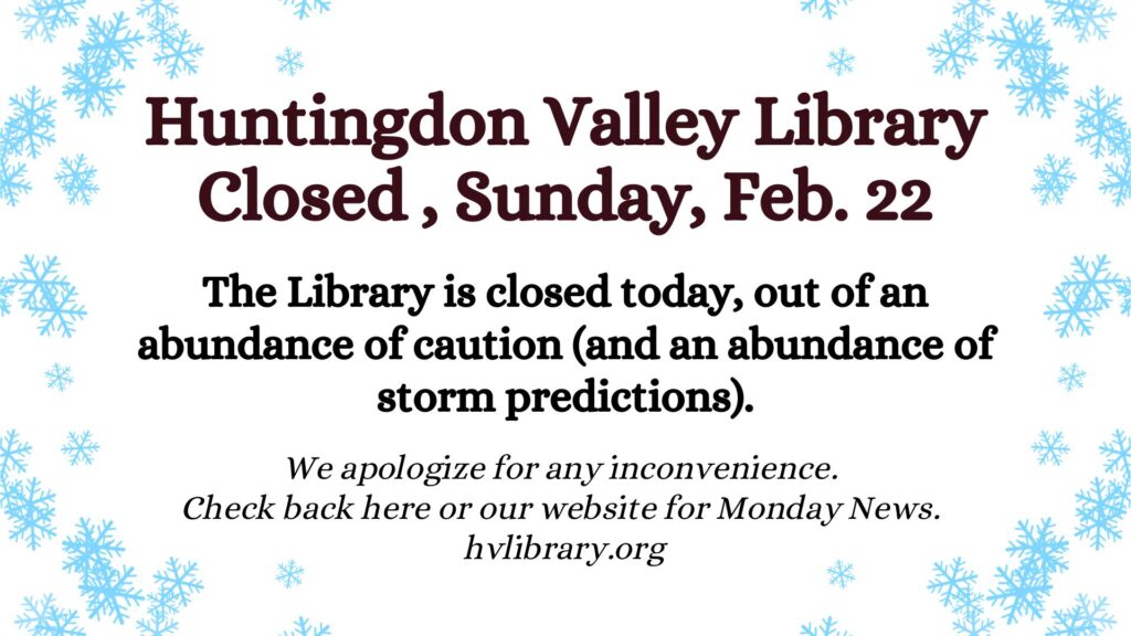 Due to the prediction of inclement weather and to ensure the safety of our staff and patrons, HV Library will be closed on Sunday, February 22. Stay safe and warm!