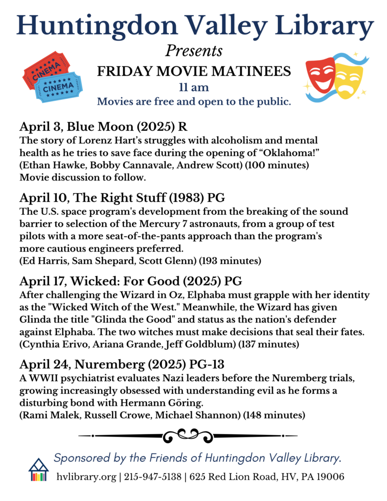 Movies are sponsored by Friends of Huntingdon Valley Library who generously pay for our movie licenses.