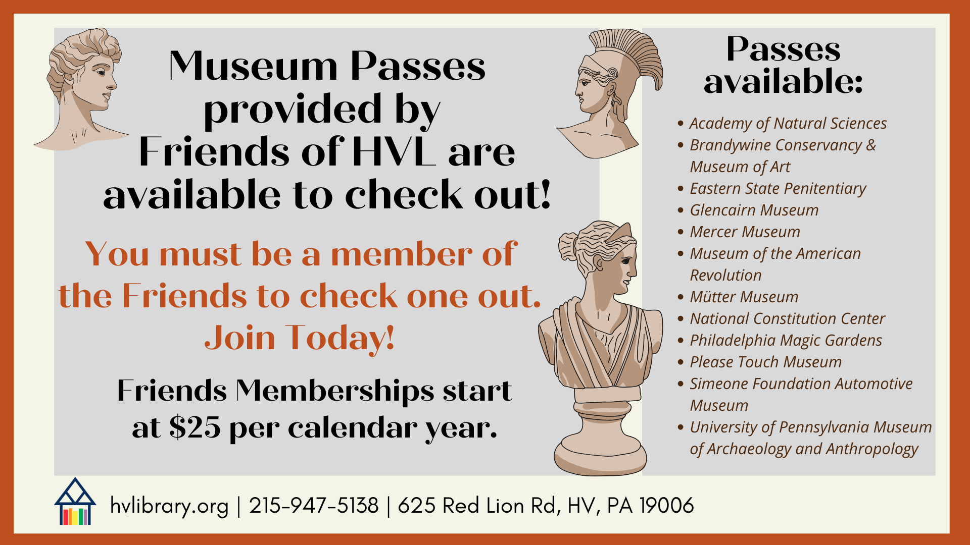 While the Museum Passes cannot be placed on hold or reserved in advance, active members are encouraged to call the Circulation desk for more information about checking out a pass over the phone for same-day pick-up. We can be reached at 215-947-5138. This year Friends of Huntingdon Valley Library have made passes available to the . . .